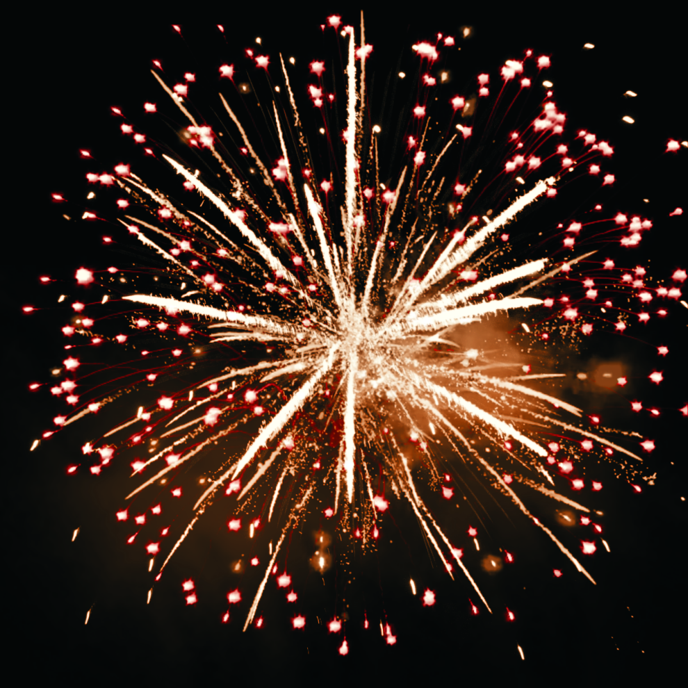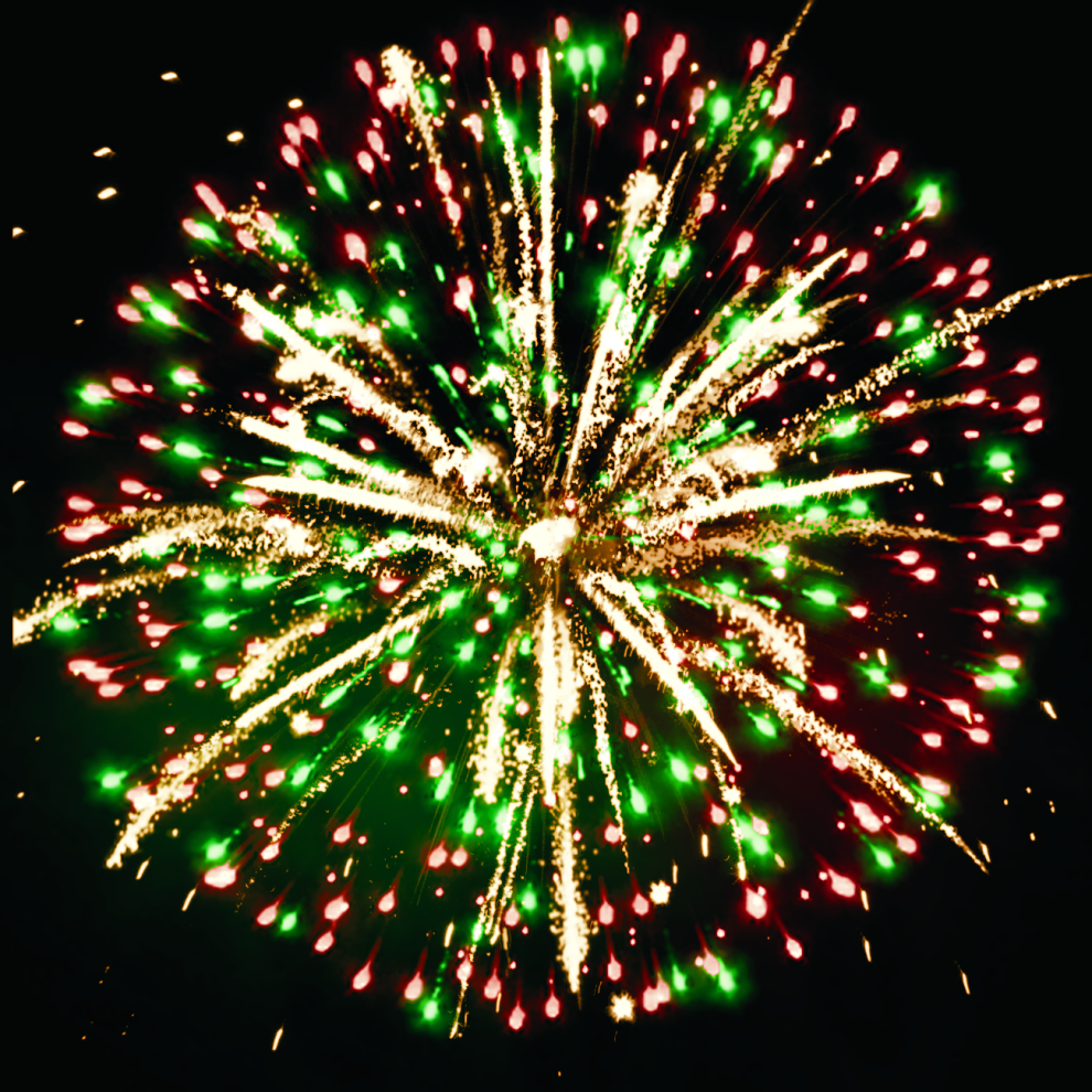 Разноцветные кометы разрываются сферами из золотых искристых форсов и золотых искр, переходящих в красные мерцающие огни.
