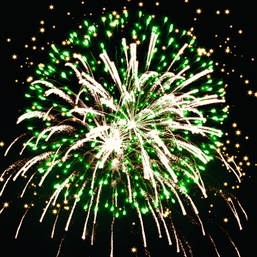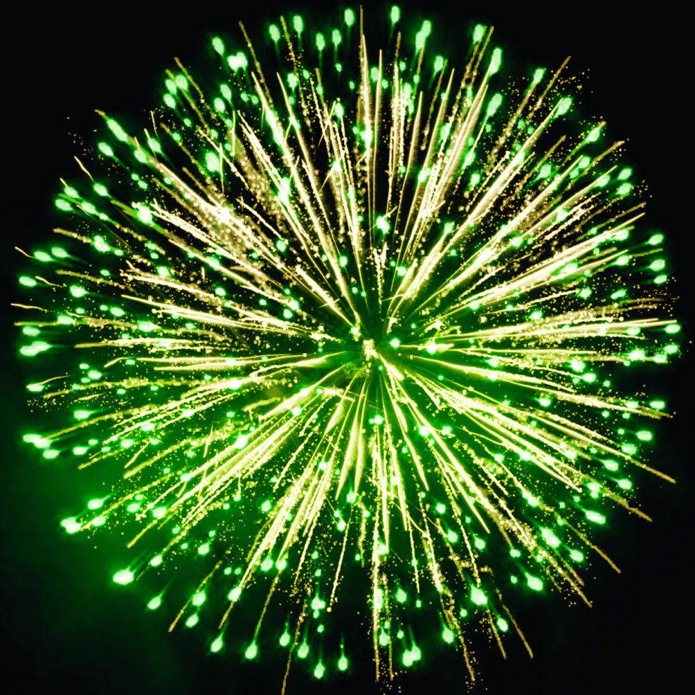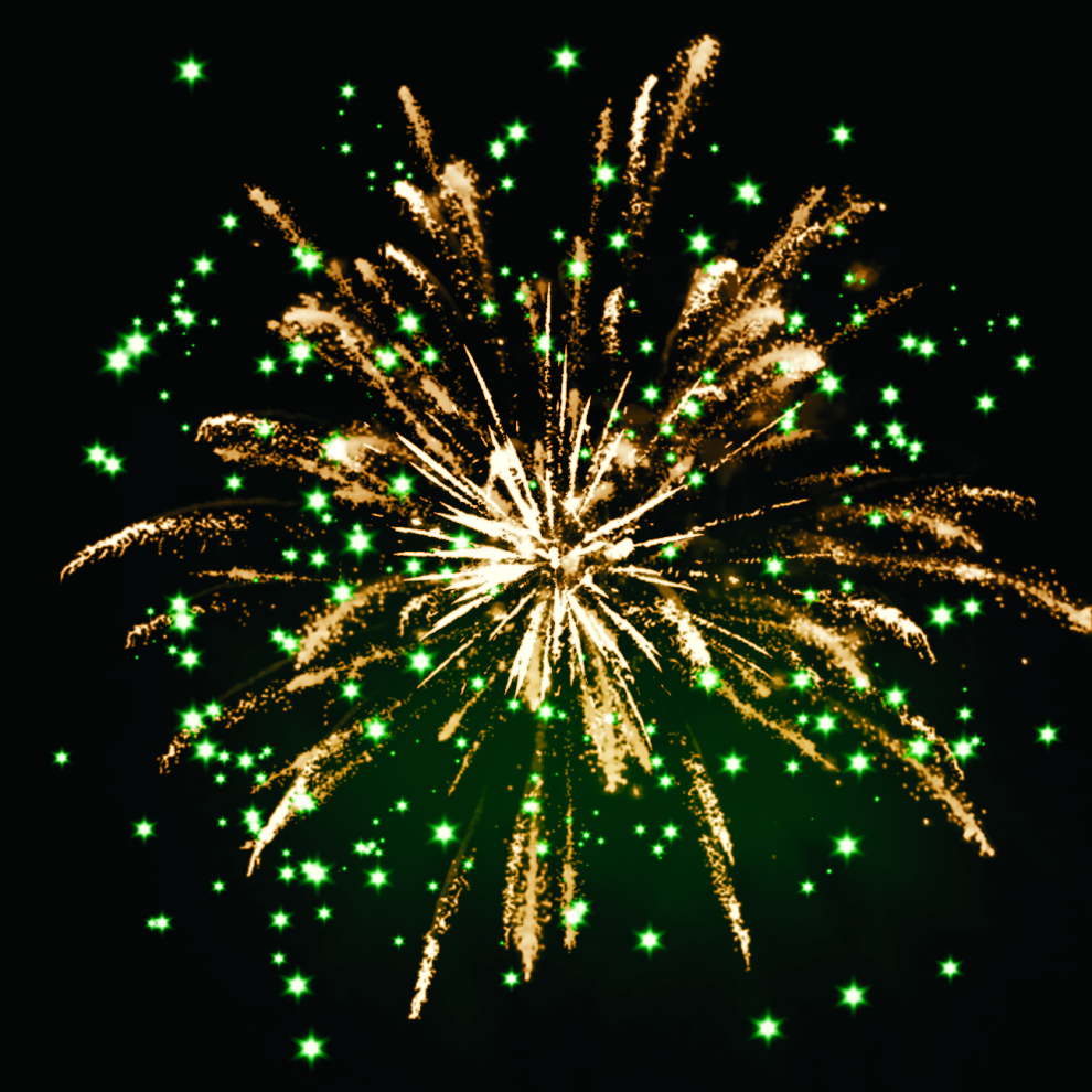 Мощный залп: золотые форсы с трещащими искрами на концах и зелёные мерцающие огни — финальный аккорд победы.