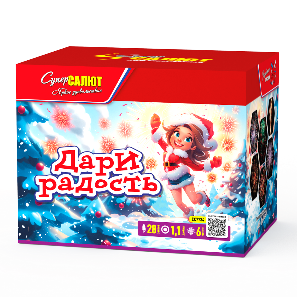 Подарите себе и близким незабываемые эмоции с этой искрящейся симфонией в ночном небе! «Дари радость» — это компактная, но невероятно насыщенная батарея, которая за 35 секунд запустит в небо 28 ярких зарядов. Шесть разнообразных эффектов, переливаясь и сменяя друг друга, создадут атмосферу настоящего волшебства и детского восторга.