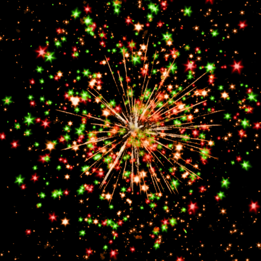 Разноцветные кометы разрываются сферами из красных, зелёных и золотых мерцающих огней.