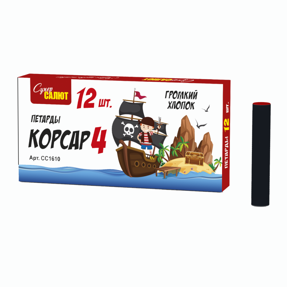 Петарда "Корсар 4" — это вершина серии, созданная для тех, кто ищет не просто громкий, а сверхмощный и оглушительный хлопок. В упаковке 12 штук, что подчеркивает её эксклюзивность и ориентированность на качество, а не количество. Это выбор для настоящих ценителей экстремальных ощущений и максимальной громкости.