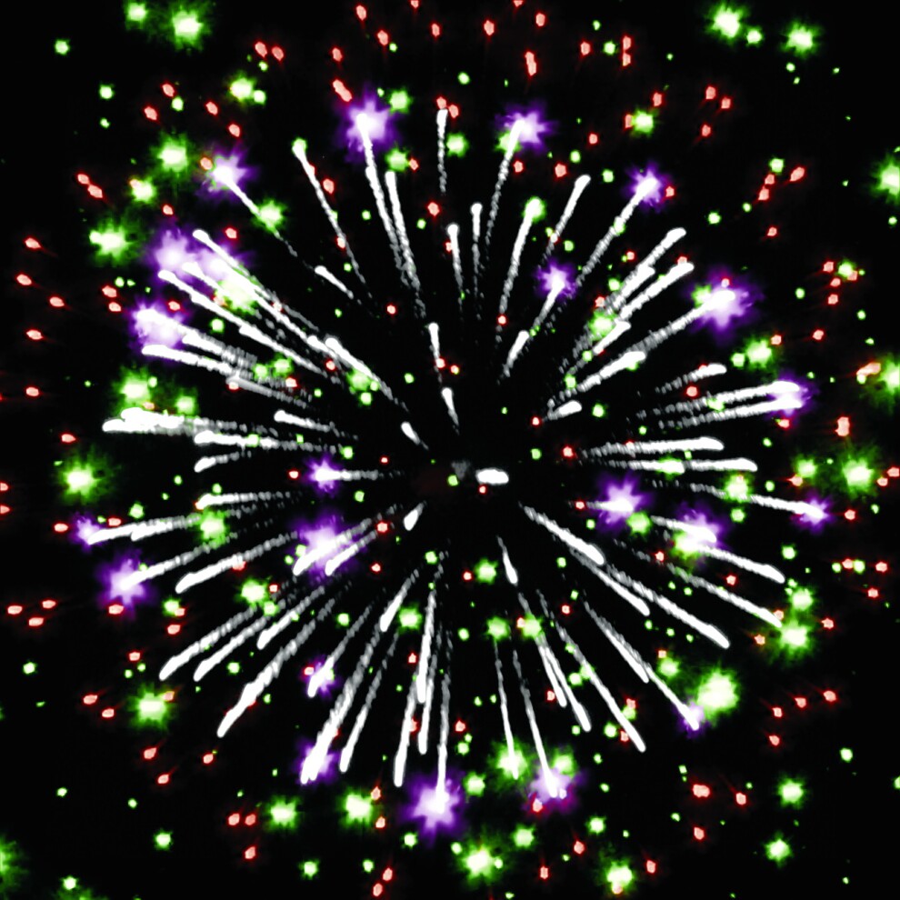 3-4. Золотые форсы с мерцающими красными и серебряными искрами, а также голубыми, фиолетовыми и зелёными мерцающими огнями. - Финальный залп: золотые форсы и синие огни, создающие эффектный завершающий аккорд.