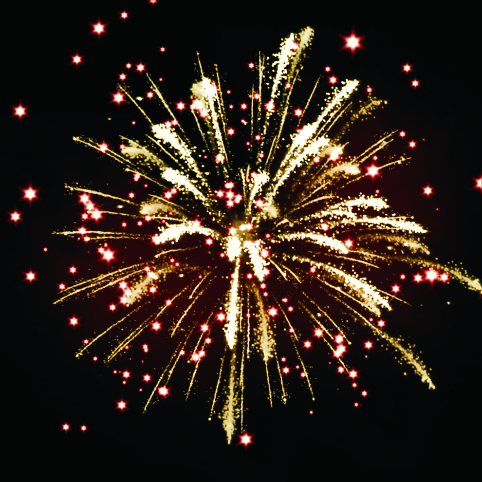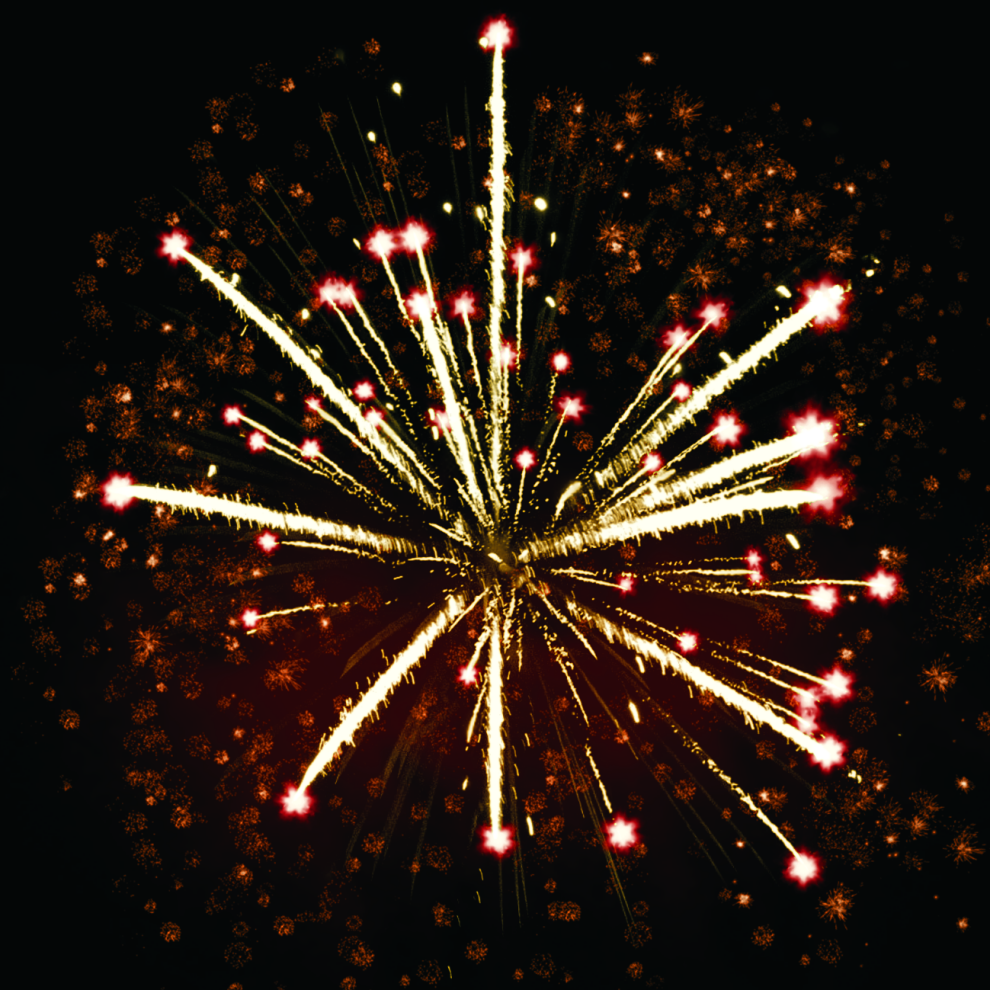 Разноцветные кометы разрываются сферами из золотых форсов с трещащими искрами на концах и красных мерцающих огней