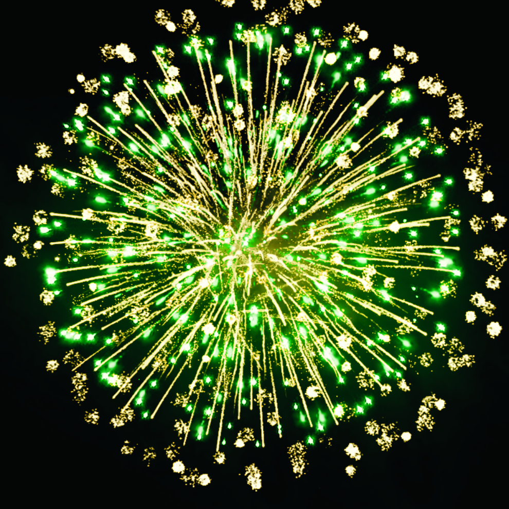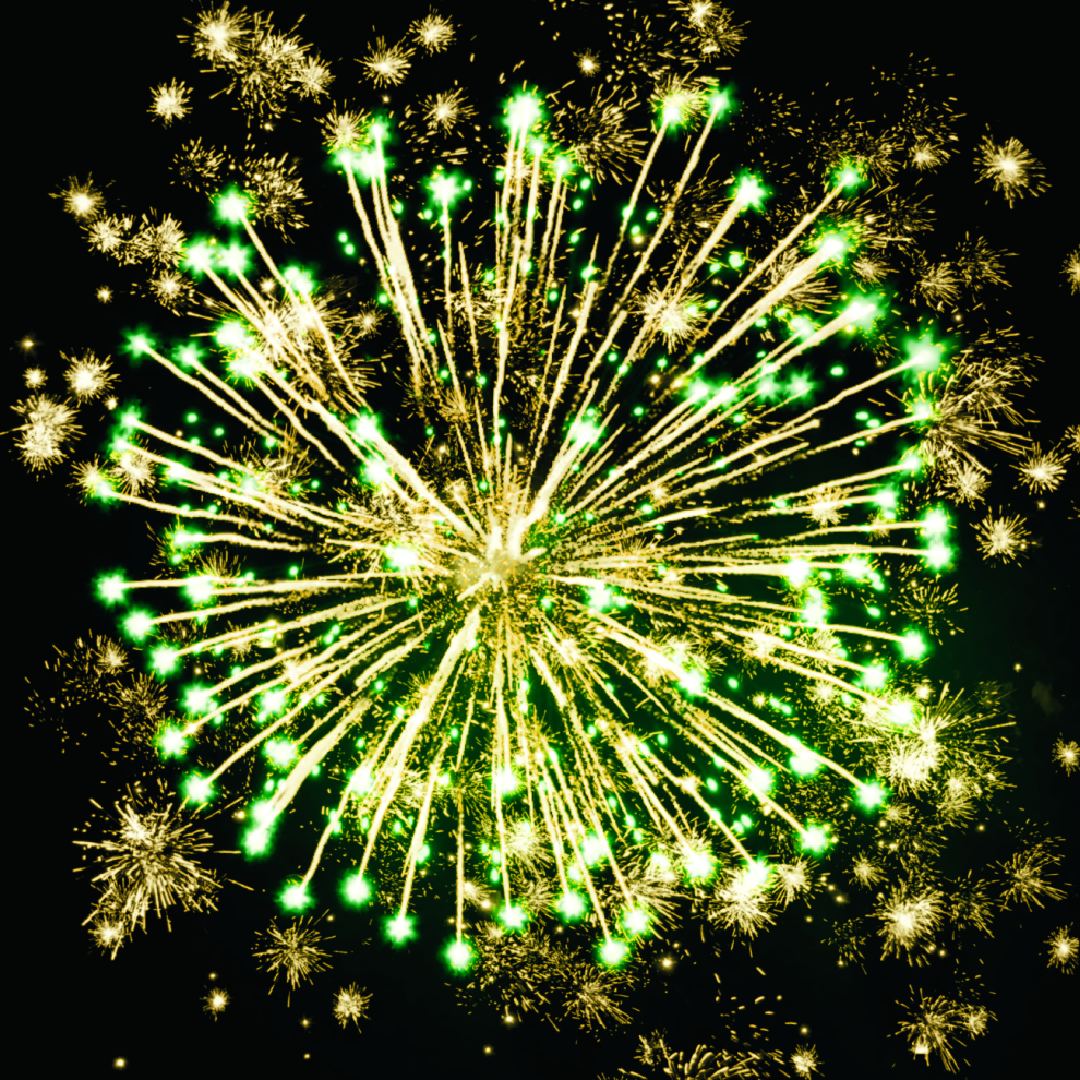 Золотые форсы с зелёными, красными огнями на концах и золотые мерцающие огни
