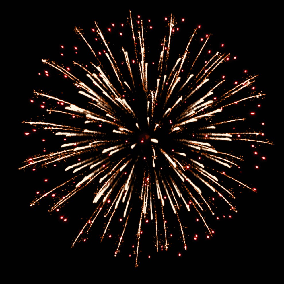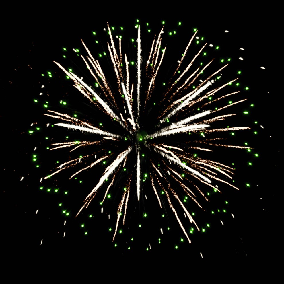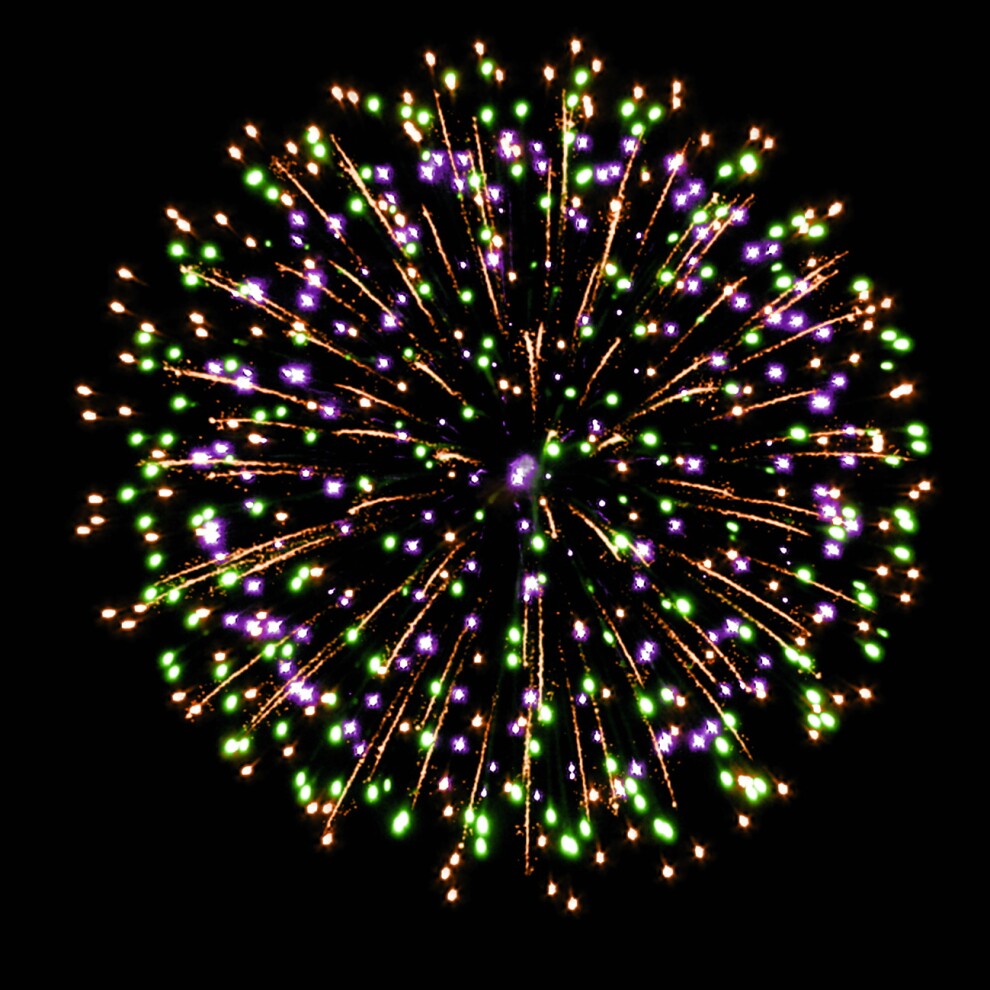 Разноцветные кометы и золотые трещащие трассы с зелёными и красными искрами раскрываются сферами: