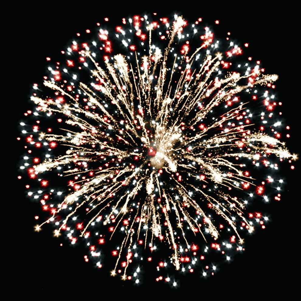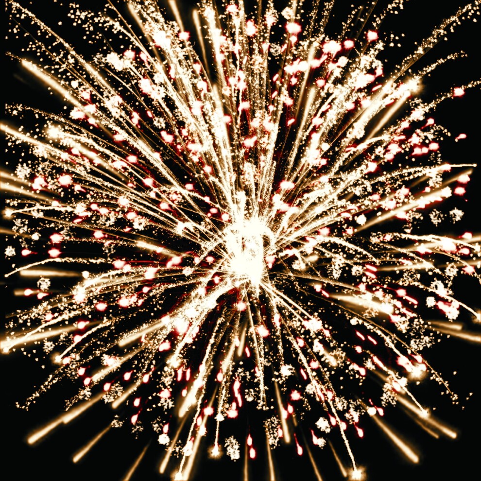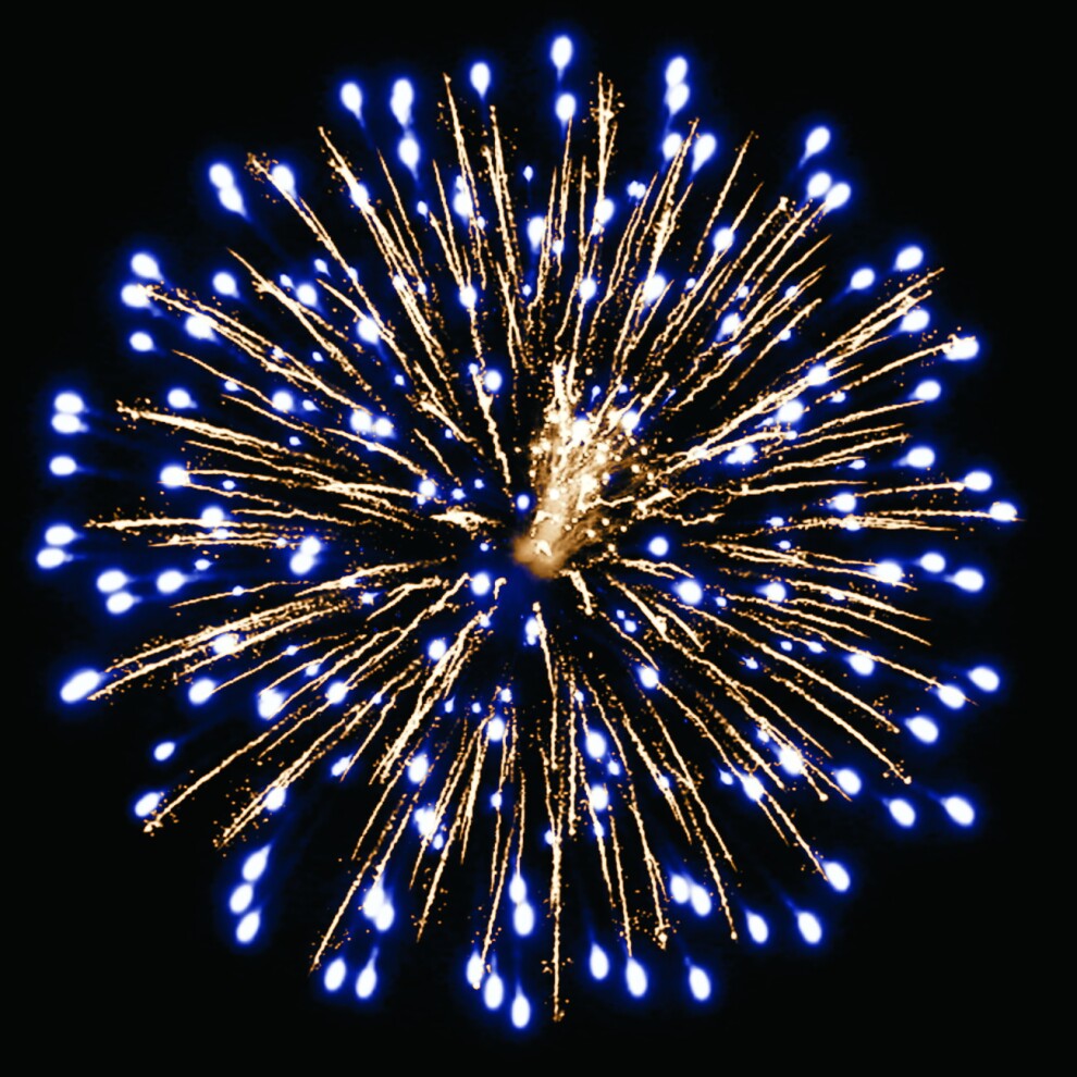 Серебряные искристые, золотые с мерцающими серебряными, красными, золотыми и трещащими искрами трассы со свистящими элементами разрываются грандиозными сферами: