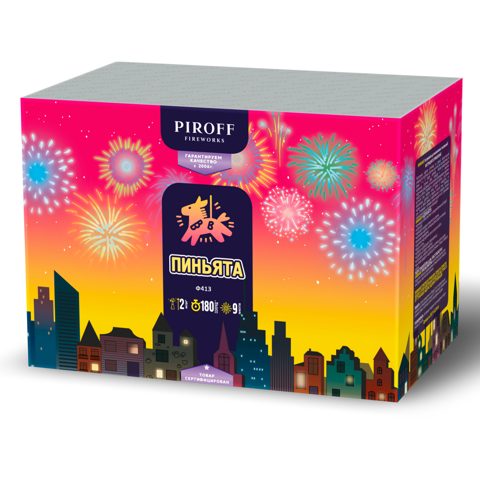 Представьте себе мощные золотые струи, переходящие в серебряное мерцание, которые сменяются цветными искрами и громкими хлопками, создающими незабываемую атмосферу веселья. «Пиньята» — это не просто альтернатива салюту, а полноценная замена, которая подарит восторг и взрослым, и детям даже на самой компактной площадке.