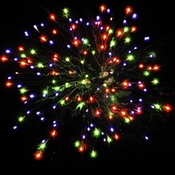 - Красные, зеленые, пурпурные жемчужины с белыми мерцающими искрами — Праздничный конфетти! Разноцветные бусины, рассыпающиеся в небе и искрящиеся белой мишурой.