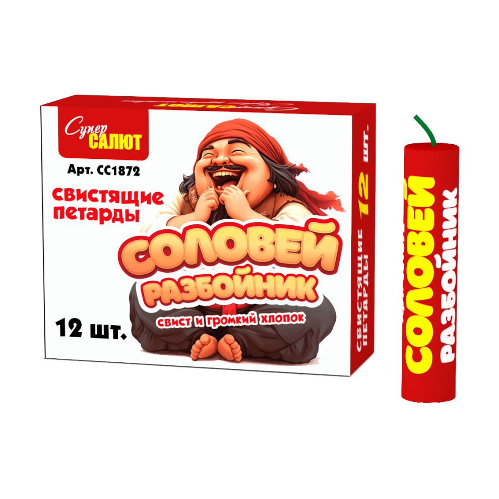 Петарды «Соловей Разбойник» — это классика с элементом неожиданности! В упаковке 12 штук, каждая из которых дарит двойной эффект: сначала пронзительный свист, а затем — громкий, оглушительный хлопок. Идеальный выбор для тех, кто любит веселье с сюрпризом и хочет добавить интриги в праздник.